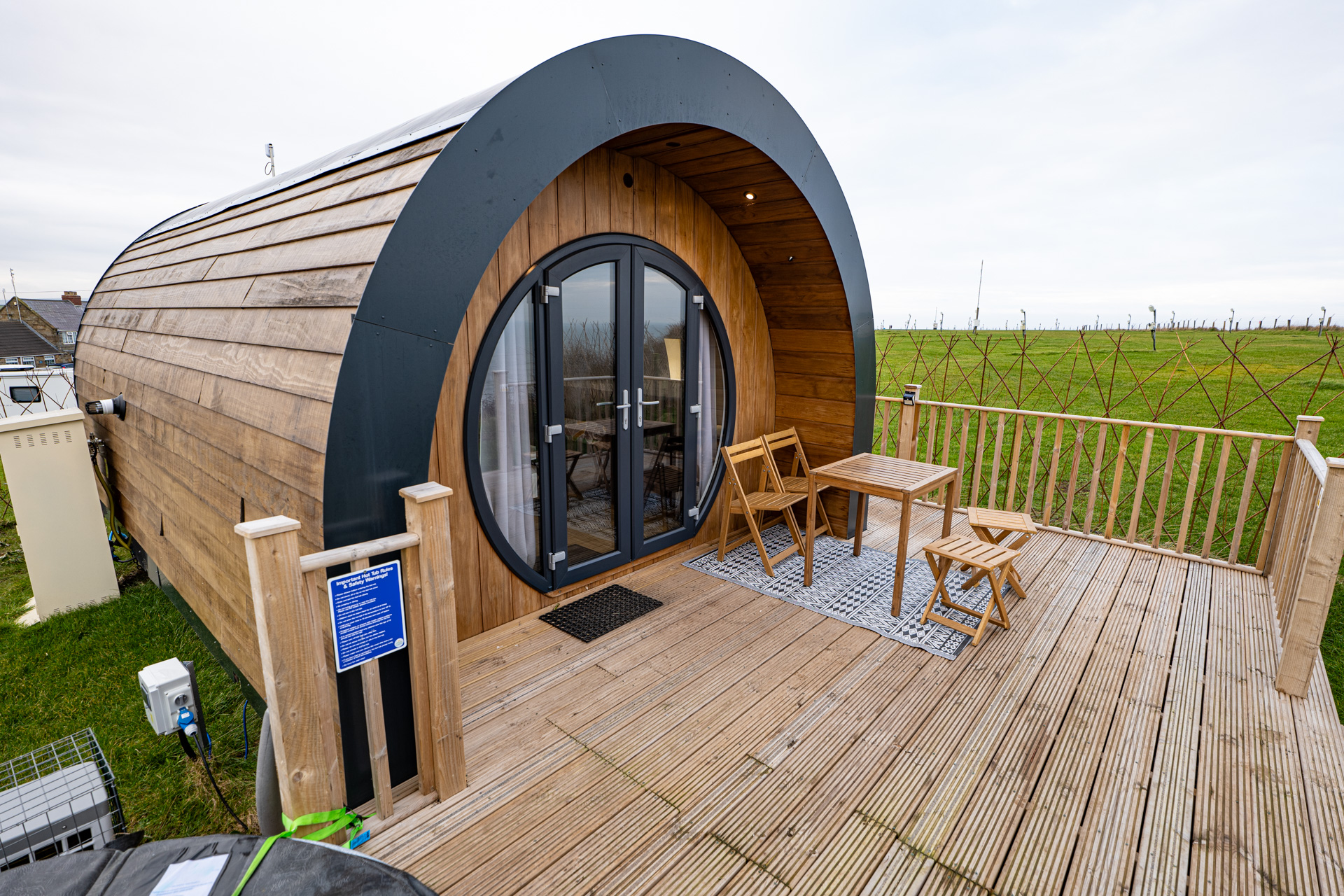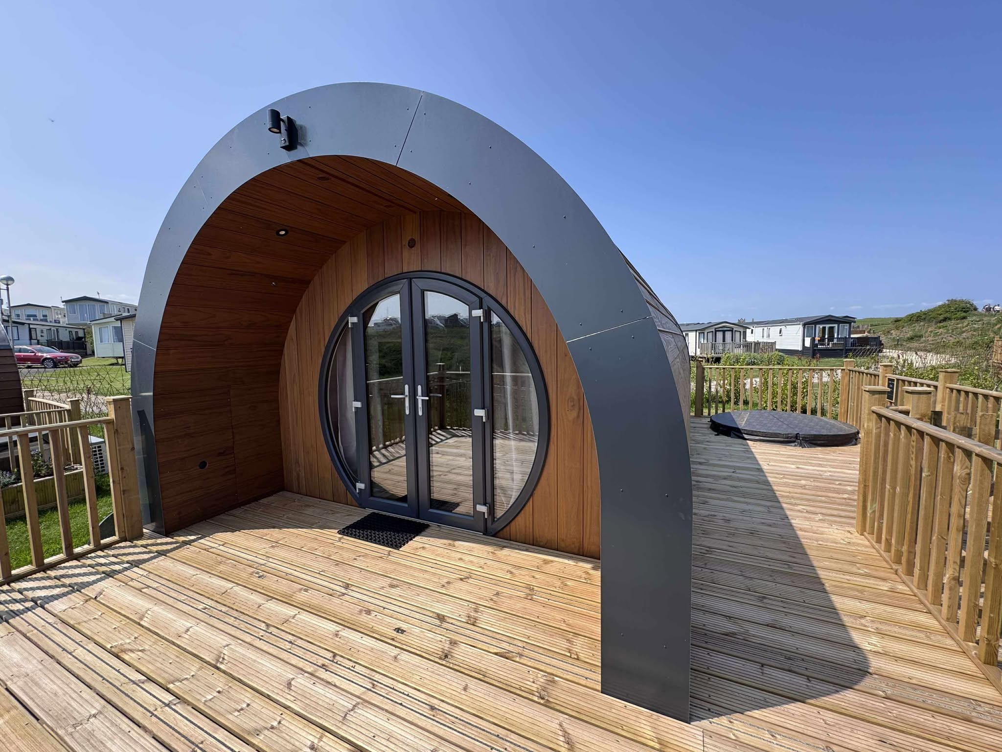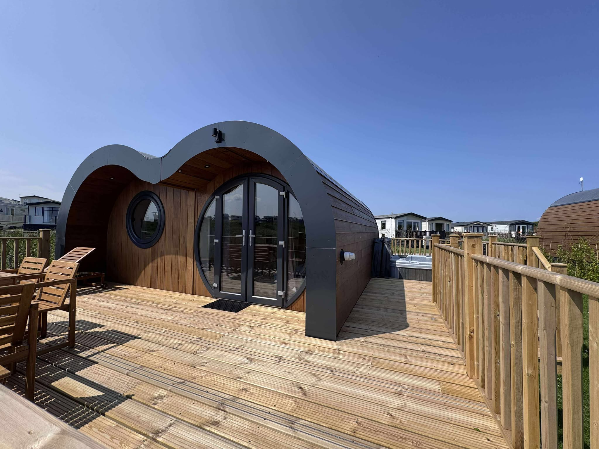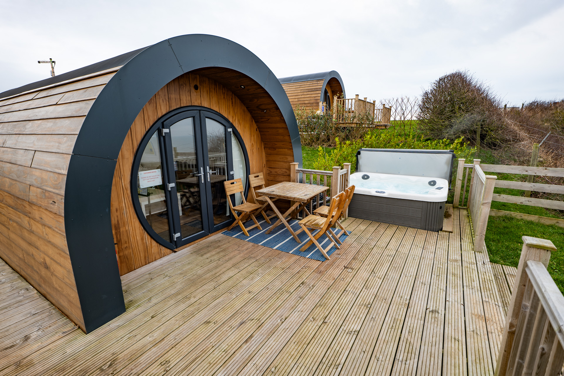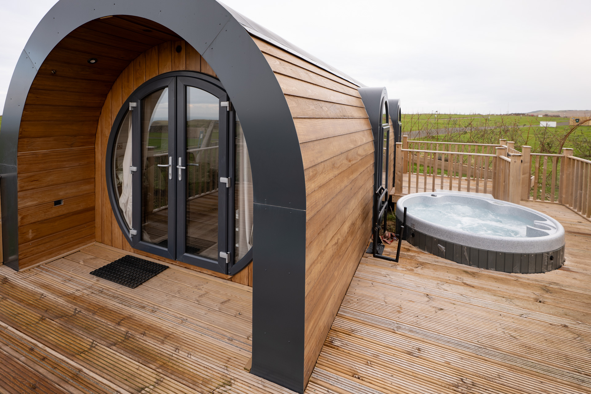 This glamping pod has all the features of an escape away from the norm, with a private hot tub, spacious open plan layout, and scenic location. The main living area hosts the double bed and sofa bed as well as the kitchenette with two burner hob, microwave, air fryer and mini fridge.